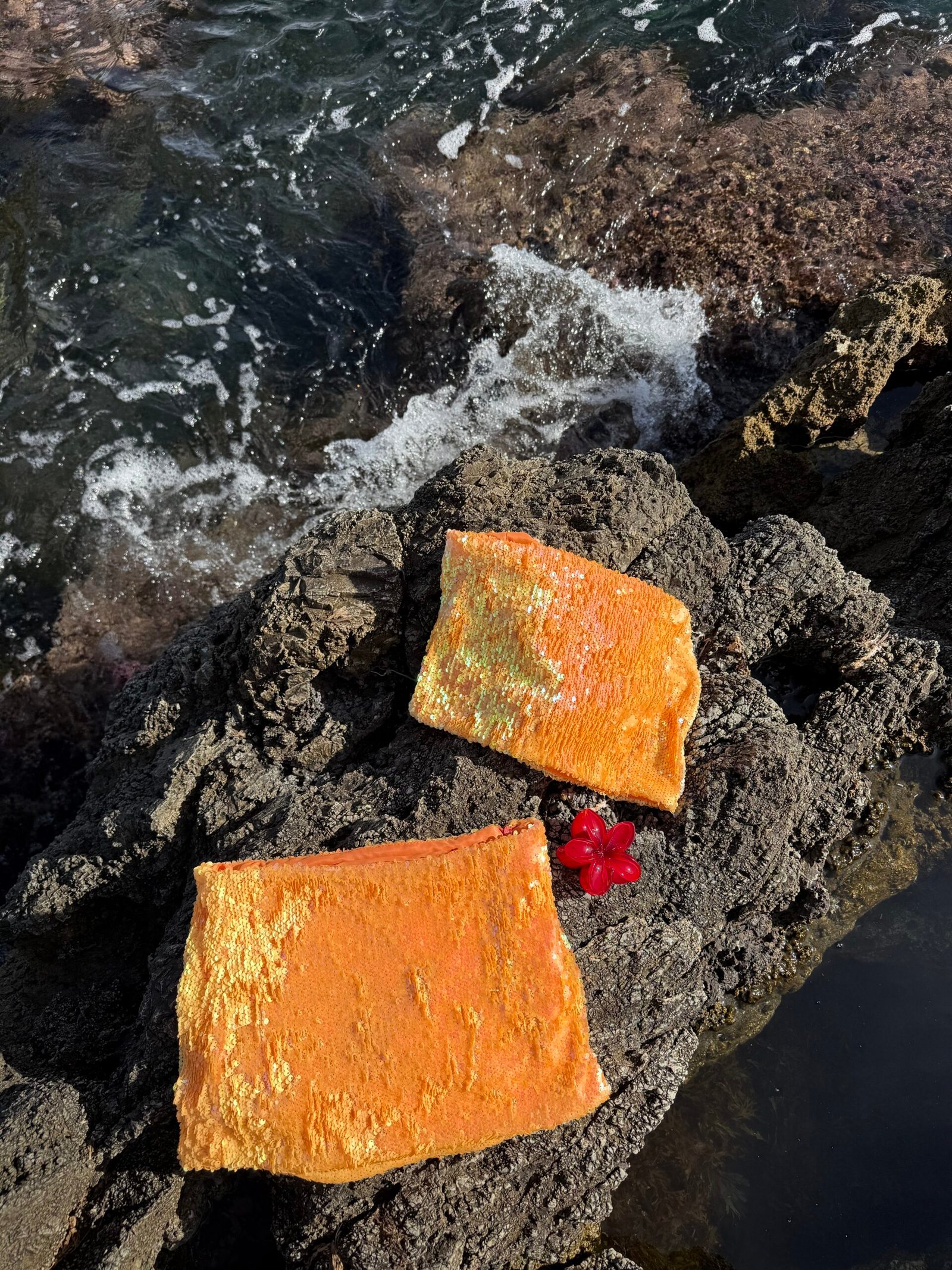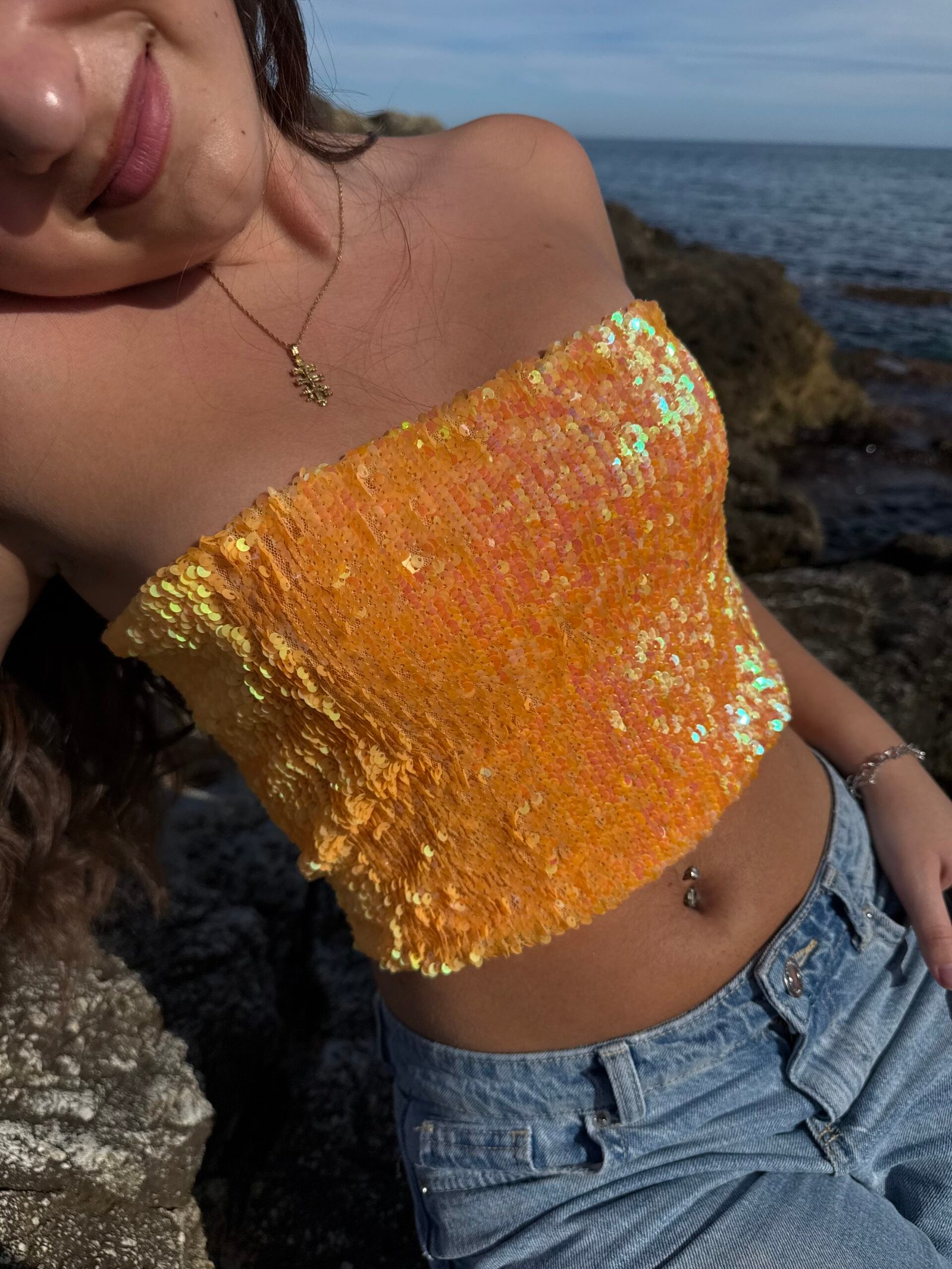 El Top Mango es un top palabra de honor en vibrante color naranja, diseñado para lucir los hombros al descubierto y realzar la figura con un toque audaz y sofisticado. Su espectacular tela de lentejuelas refleja la luz en cada movimiento, aportando energía, frescura y mucho estilo.