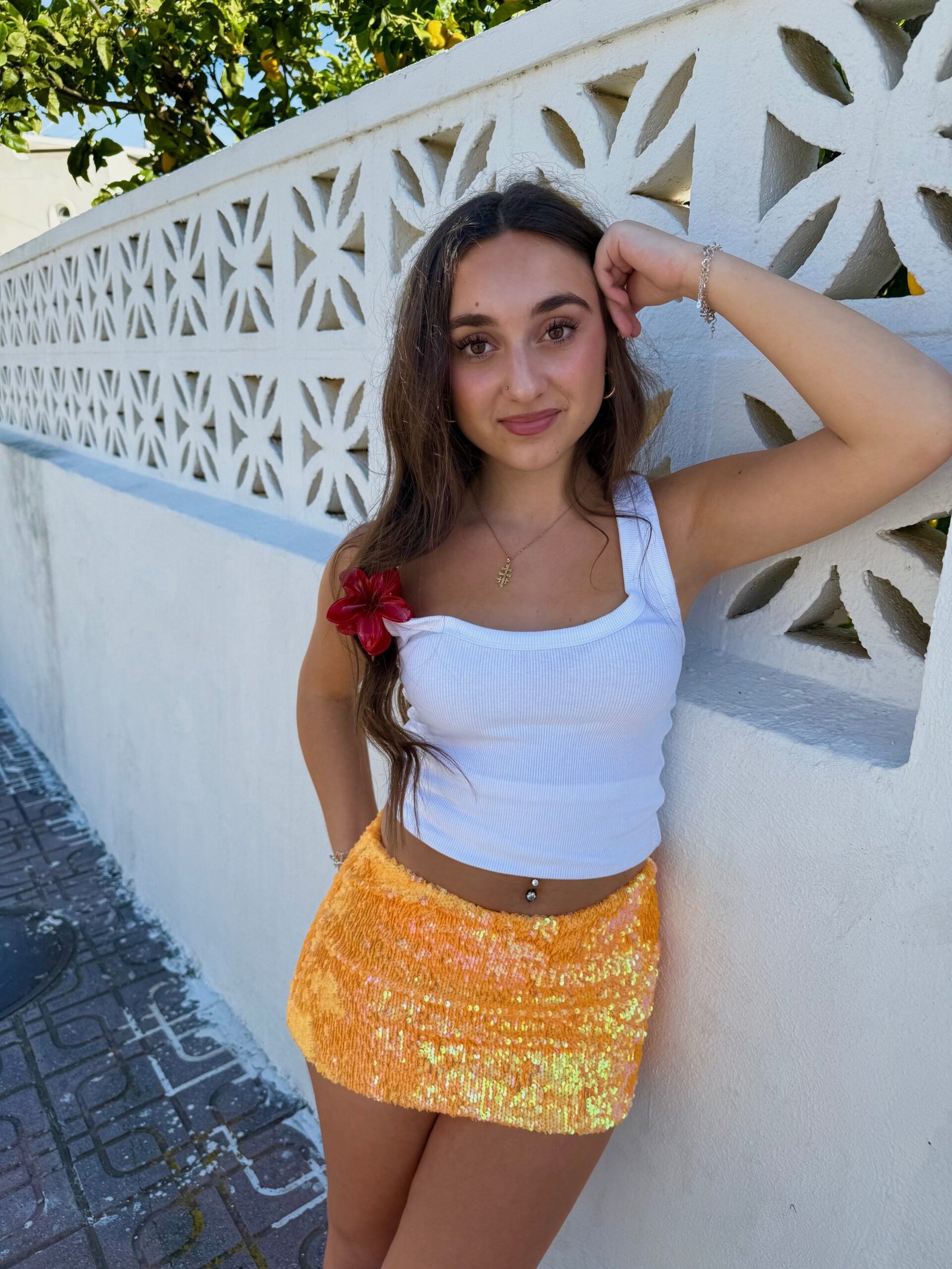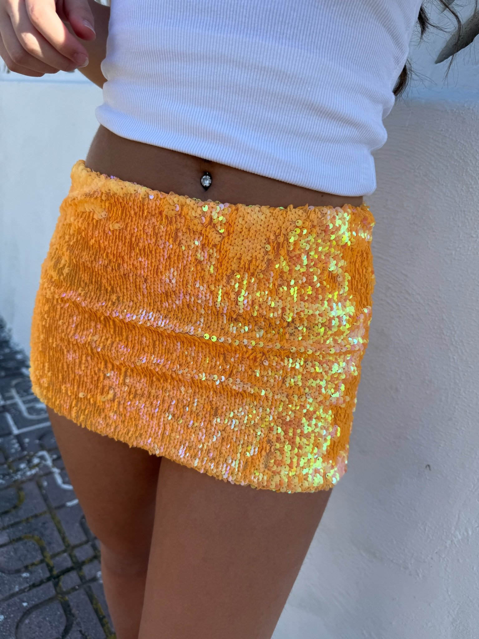 Atrévete a deslumbrar con nuestra Falda Mango, una mini falda en vibrante color naranja confeccionada en una espectacular tela de lentejuelas que refleja la luz con cada movimiento. Su diseño ajustado y de corte mini estiliza la figura, aportando un toque audaz y lleno de energía.