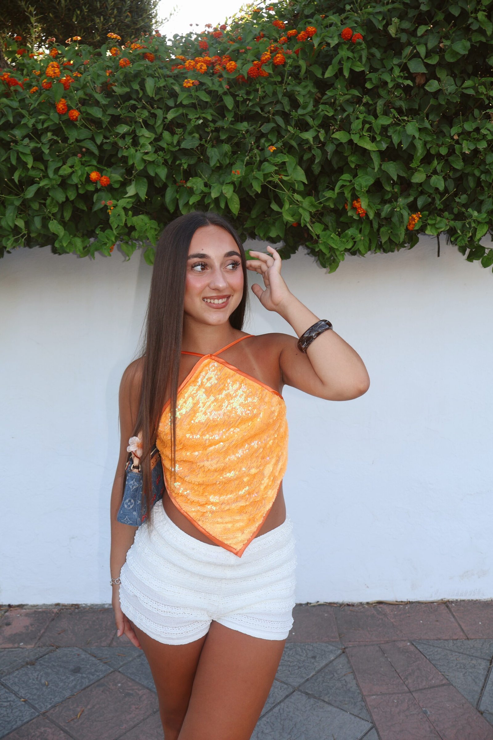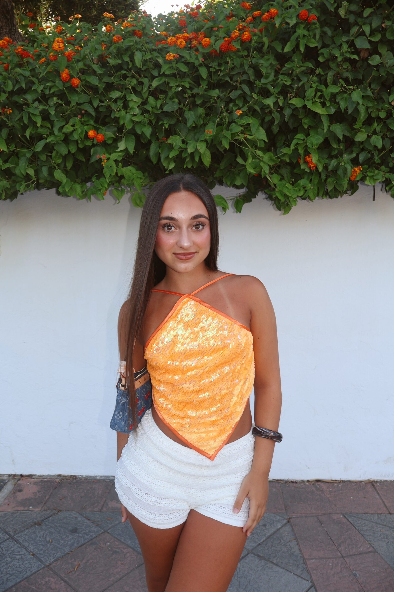 Atrévete a destacar con nuestro Top Peach, un top naranja confeccionado en una deslumbrante tela de lentejuelas que refleja la luz desde cualquier ángulo. Su diseño en forma de rombo aporta un estilo moderno y atrevido, perfecto para quienes aman brillar con personalidad propia.